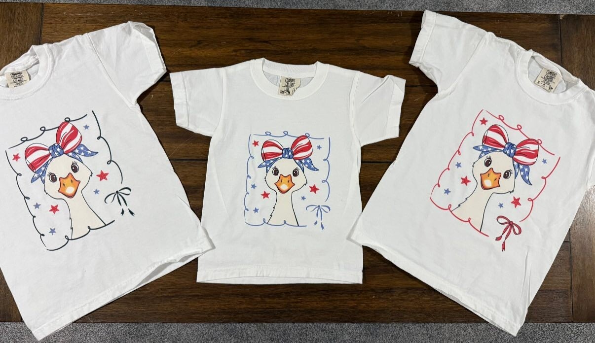 This T-shirt features a cute and patriotic illustration of a duck wearing a bow with the American flag design—red, white, and blue stars. The design is playful and festive, perfect for celebrating national holidays like Independence Day or Memorial Day with a fun, lighthearted vibe. Ideal for casual wear and showing off your patriotic spirit.